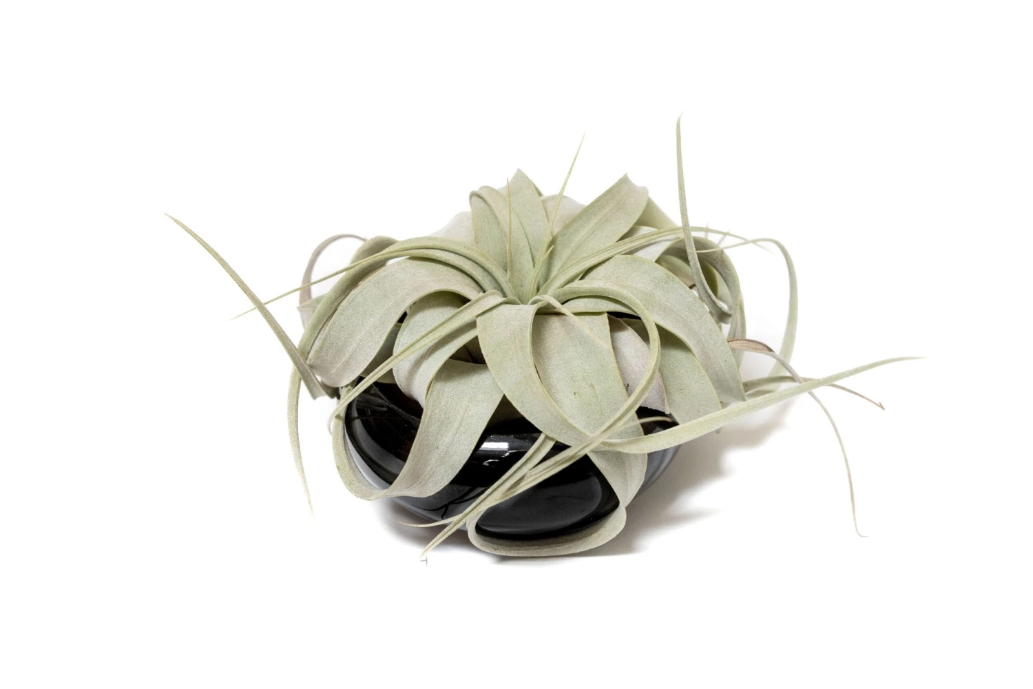 Our Seedling Xerographica looks adorable in our small black dish holders. The small, curly, silver leaves contrast beautifully with the holder. Great gift idea or friend in the office. The black dishes are made of high quality, kiln-fired, terracotta and are dipped in a rich black glaze. The Xerographica adds about two inches to the height of the design.