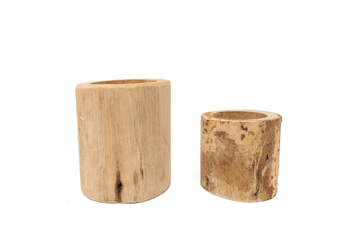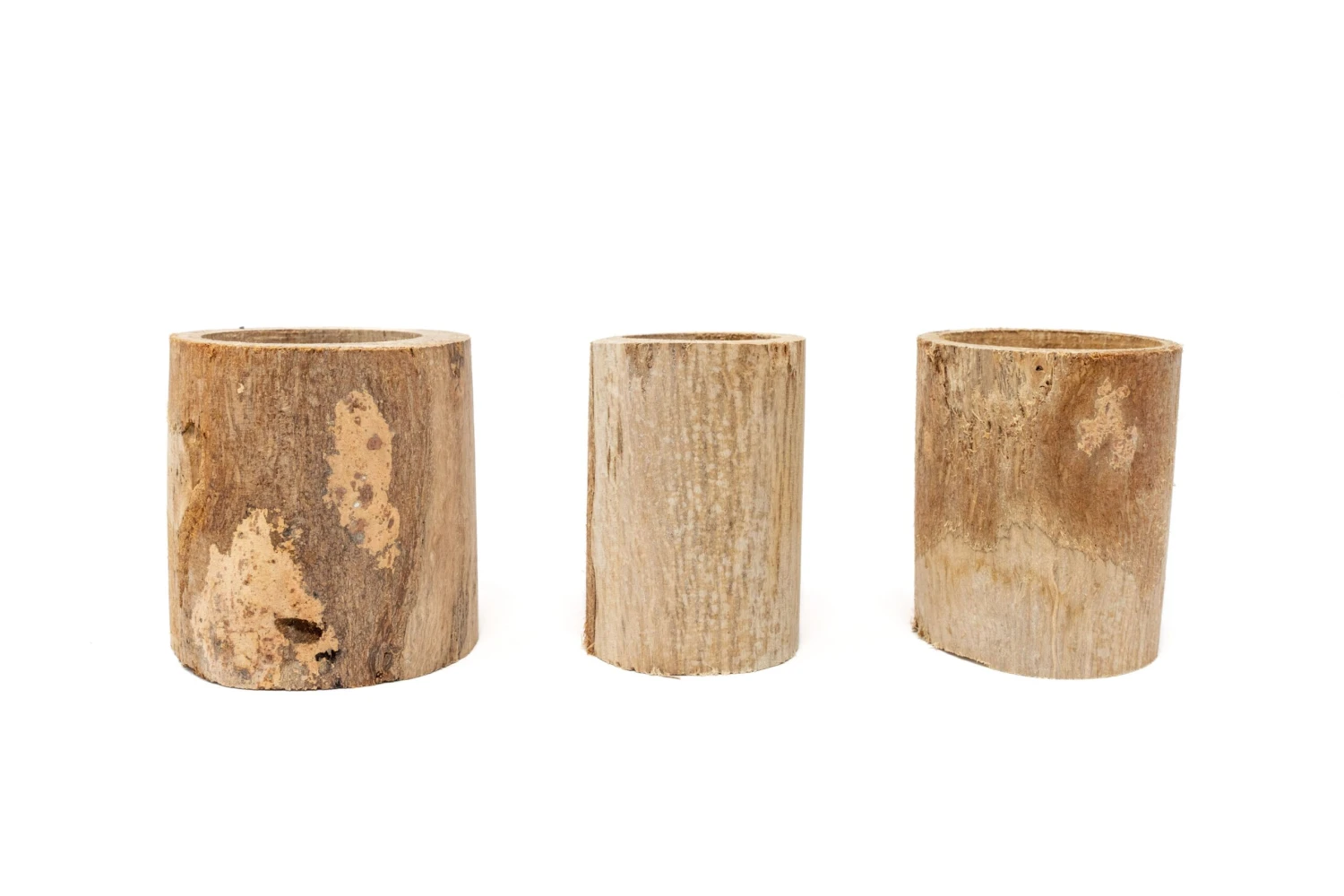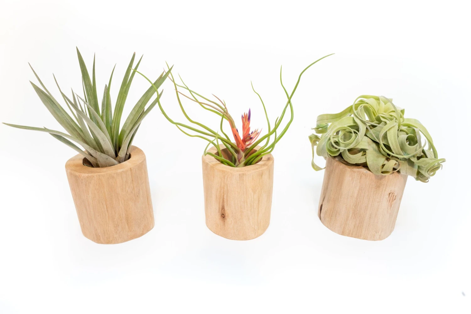 Our hand-carved driftwood containers are made from sun-bleached wood stumps and are a beautiful container for many of our medium to large sized air plants. There are some cracks and imperfections in the wood as every piece is unique.Â