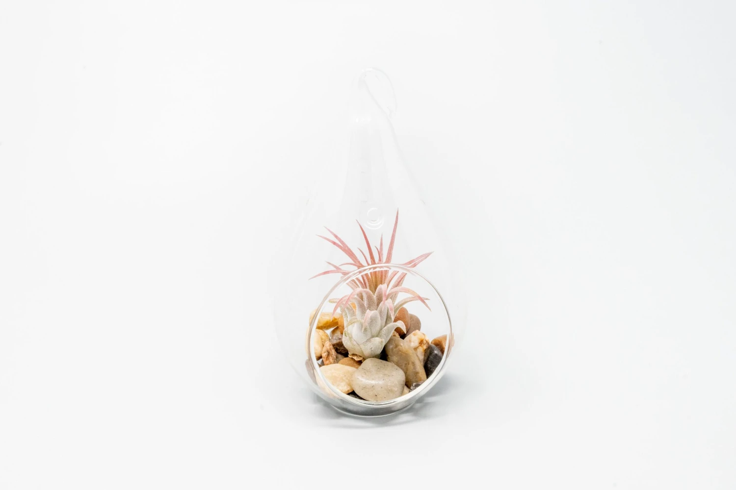 Showcase exotic Argentea Thin (Right), Abdita (Middle), and Ionantha Guatemala (Left) air plants in hand-blown glass teardrop-shaped terrariums complete with smooth river stones. Artistically hung in groups of three, or placed on a table with their flat bottoms, these arrangements will add a gorgeous touch of nature to the indoors.