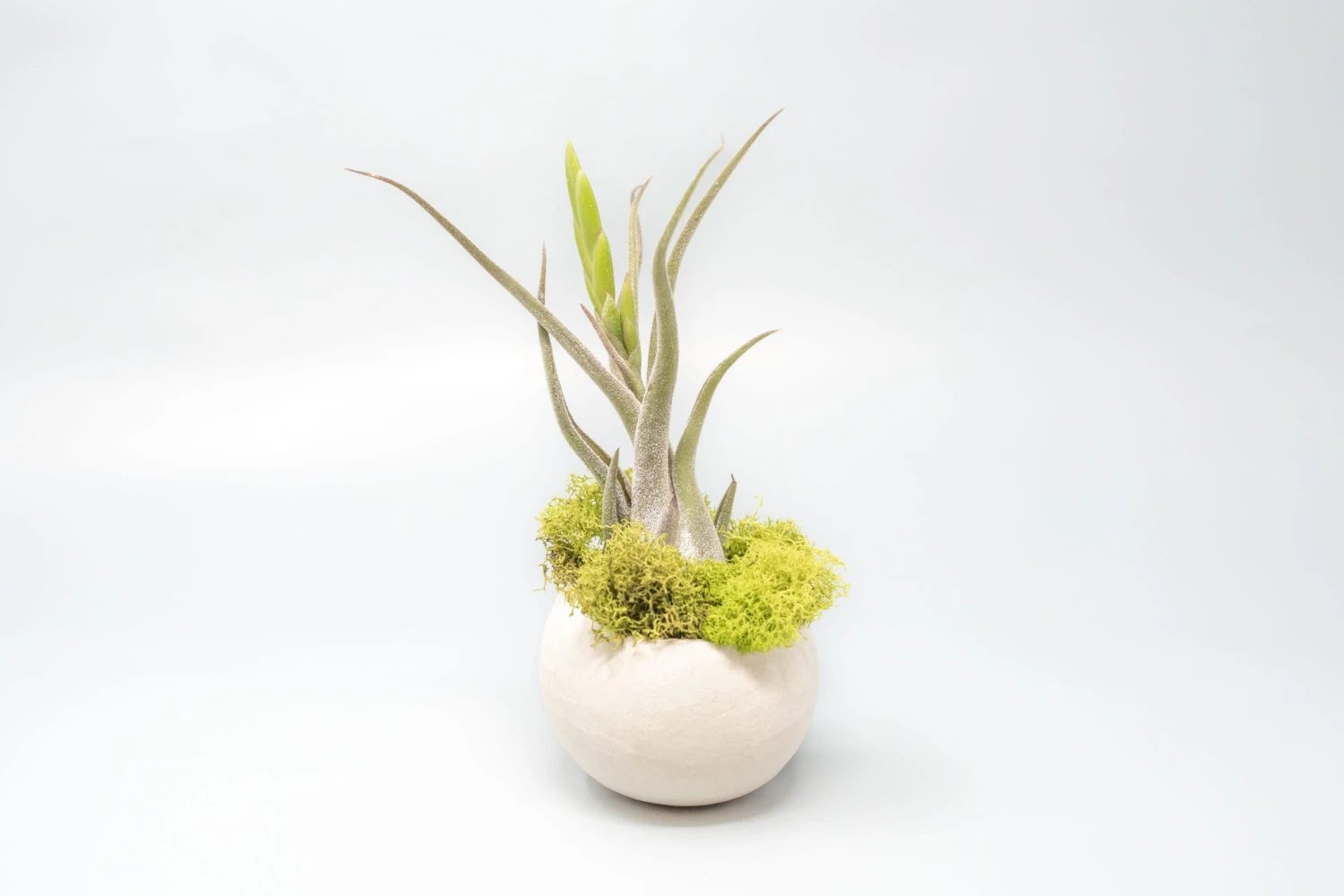 Statement pieces can come in small packages! Enjoy your new unique Tillandsia air plant held in a beige-colored seed pod. A pinch of preserved chartreuse reindeer moss is included. Opening up this gorgeous air plant will brighten anyone’s day. This easy-to-care-for arrangement is perfect for offices, kitchens, side tables, or party decor. Species will vary and may contain but are not limited to Caput Medusae, Abdita, Velutina, and Melanocrater.Â