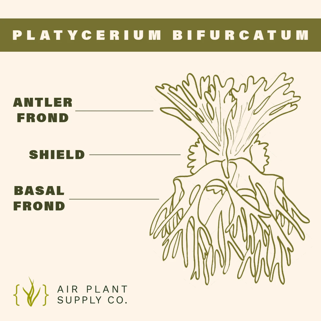 Our plants are mounted and have naturally attached themselves to a thick cedar plank with their shield (also known as basal fronds) and include a hook for hanging. They each have 4-7 antler fronds that are 10-18 inches long. In climates with regular winter freezes, treat your Staghorn as you would you an indoor air plant: Provide them bright light and a heavy misting once a week. Avoid cold and drying drafts in the winter. These plants are also appropriate to use in large reptile or vivarium enclosures. For much of the country, move your staghorn outside for the summer months by hanging in a tree or on the wall of a porch where they can enjoy rain and summer humidity.Â
