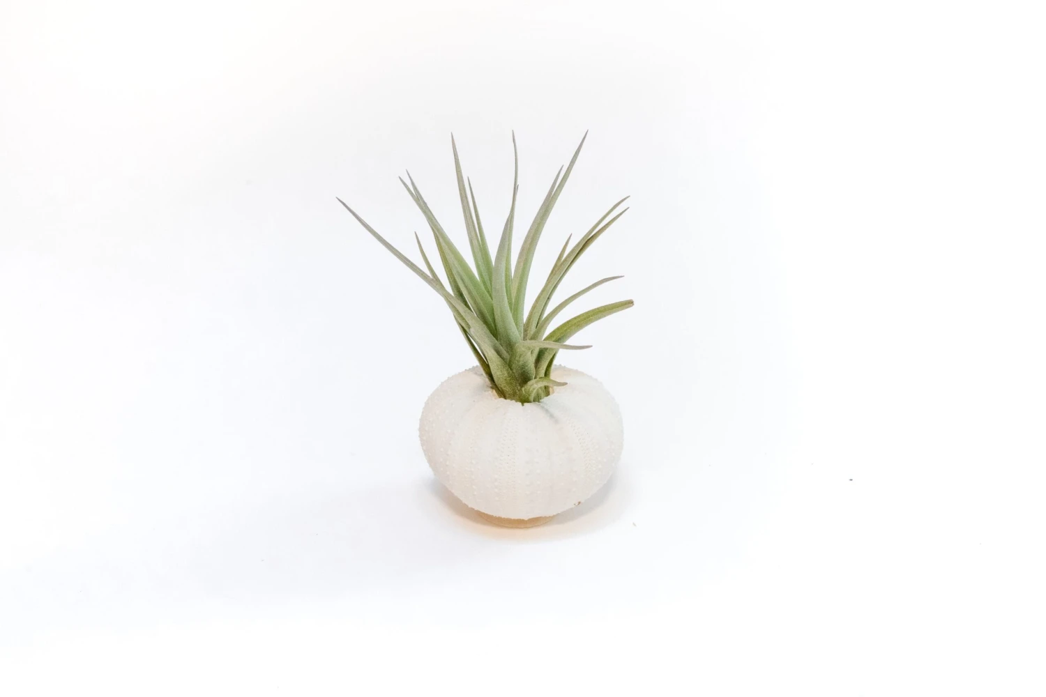 These White Urchin shells measure about 1-2 inches wide and 1 inch tall. The Ionantha air plants are about 1.5 inches tall. No glue or filler needed. The air plants fit perfectly in these cute little shells. These urchins are predominately white but may have hints of pink or lavender colors. This listing includes one urchin and one air plant.